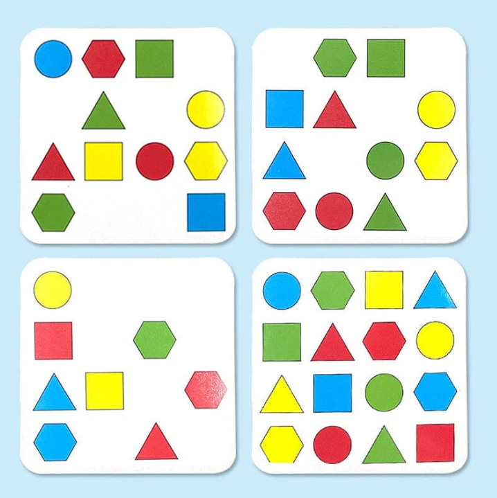 Cada tarjeta tiene distintas combinaciones de figuras, lo cual lo hace muy divertido y fomenta la concentración y el análisis.