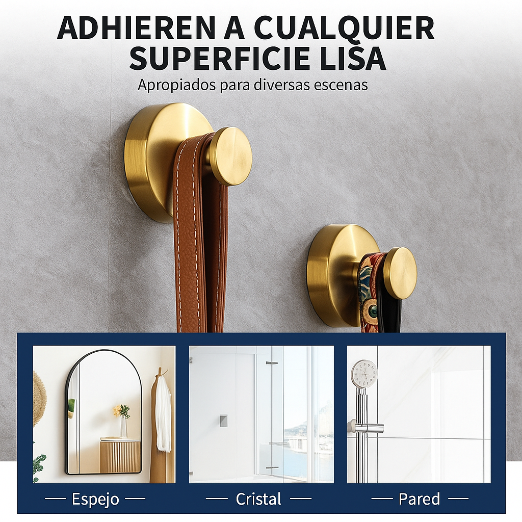 Los ganchos de succión son adecuados para superficies planas y no porosas como vidrio, espejos, mármol, cerámica, acero inoxidable, madera, acrílico, plásticos y laminados.