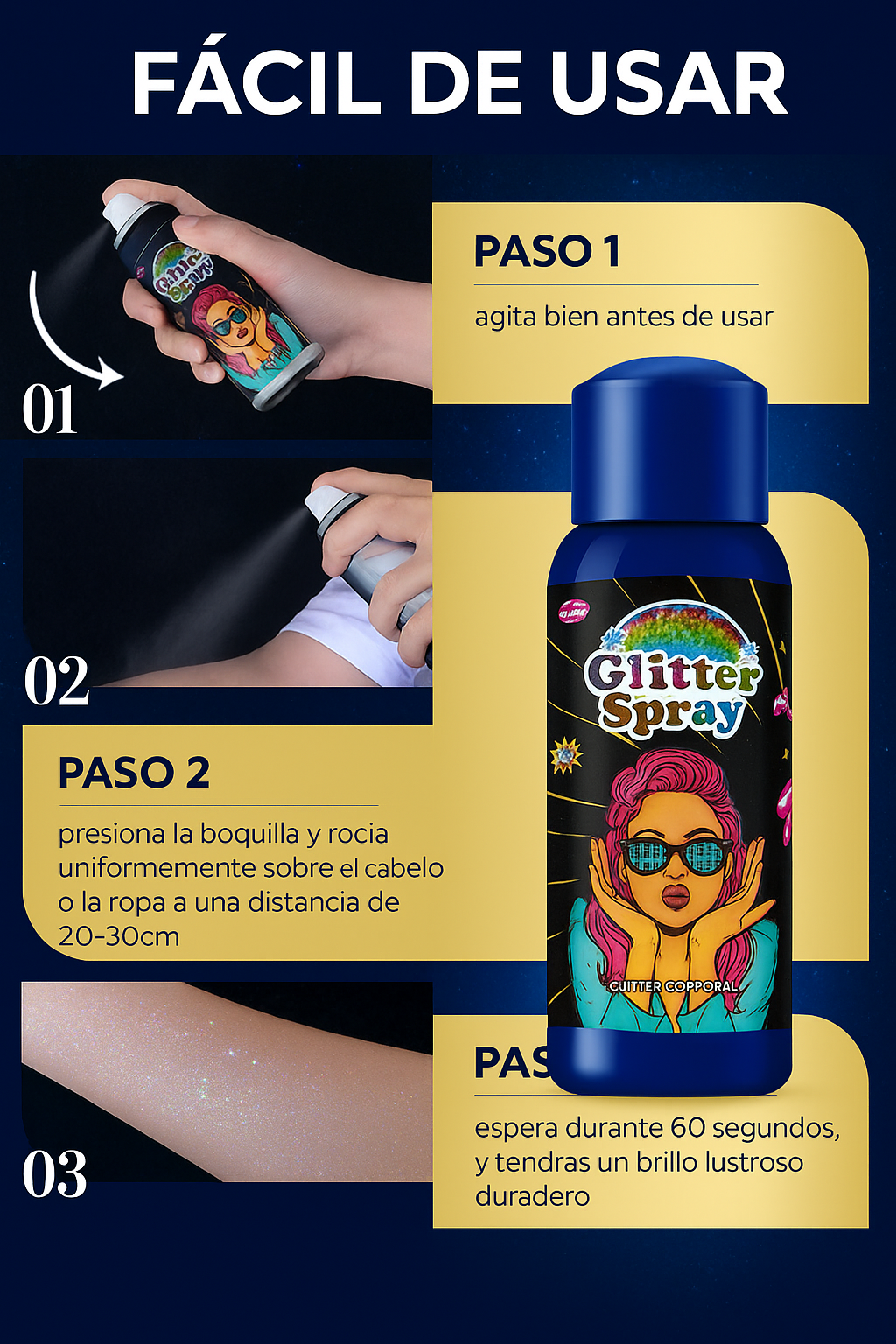 Disfruta de una purpurina duradera. Una vez aplicado, este spray de purpurina proporciona un brillo luminoso y duradero, para que brilles con luz propia desde que sales de casa hasta que te vas.